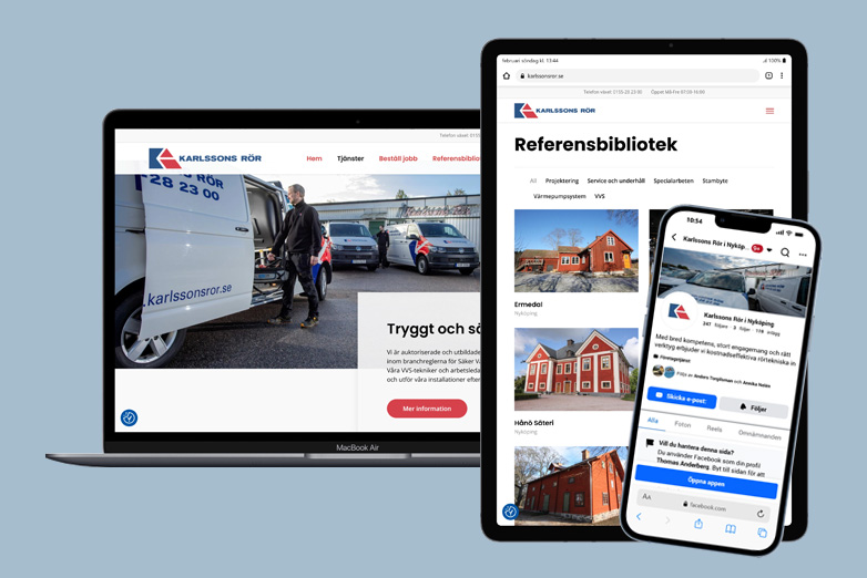 Karlssons Rör-caset visar hur långsiktigt samarbete växer tillsammans med företaget. Från den första webbplatsen 2016, via ombyggnad och social media-strategi 2020, till jubileumslogotyp och dokumentär-landningssida 2025. Vi har funnits med från 11 till 17 anställda, från första bildmaterialet till att berätta företagets 30-åriga historia.